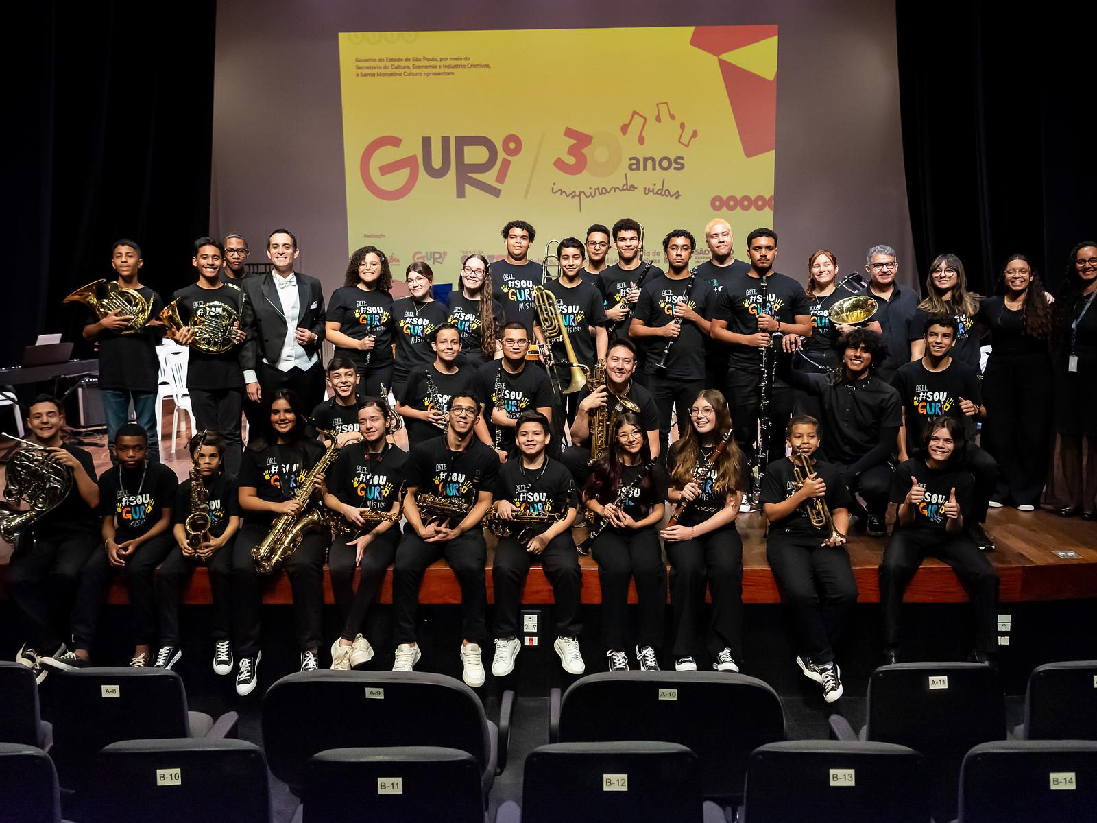 O nome “banda” é utilizado para definir uma orquestra formada por instrumentos de sopros com madeiras: flautas, clarinetes, saxofones, oboé e fagote; metais: trompete, trompa, trombone, eufônio e tuba; e percussão com tambores, pratos, xilofone e diversos outros. Diferencia-se da orquestra sinfônica por não ter instrumentos de cordas, como o violino. A Banda Sinfônica do GURI de Bauru foi criada em 2012, já se apresentou ao lado da The Rodney Mack Philadelphia Big Brass (EUA), no Auditório Ibirapuera; tocou no 10º Festival de Inverno de Boituva; realizou virtualmente concerto com João Donato e Maurício Freire Garcia, Hermeto Pascoal e Antônio Carlos Souza. Já recebeu regentes como Devanildo Balmant, Sarah Higino, Lutero Rodrigues, Fabricia Mikaela, Marcelo Marganha e Franklin Ramos. Participou do Encontro de Bandas do GURI em São Paulo, sob regência de Yudania Yudania Gomez (Cuba), com concertos no Theatro São Pedro.